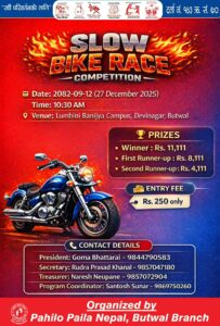 बुटवल :- पहिलो पाइला नेपाल बुटवल शाखाको आयोजनामा भएको स्लो बाइक रेस प्रतियोगितामा विनोद कालिराज प्रथम भएका छन्। बुटवलको देविनगरस्थित लुम्बिनी वाणिज्य क्याम्पसको खेल मैदानमा आयोजित प्रतियोगितामा ७० जना प्रतिस्पर्धीलाई पछि पार्दै कालिराजले पहिलो स्थान हासिल गरेका हुन्।