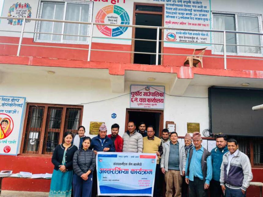 धुर्कोट :- धुर्कोट गाउँपालिका वडा नम्बर ६ मा सञ्चारकर्मी तथा सरोकारवालाहरूको सहभागितामा बालमैत्री अभ्यासलाई कसरी अझ प्रभावकारी बनाउन सकिन्छ भन्ने विषयमा केन्द्रित अन्तरक्रिया कार्यक्रम सम्पन्न भएको छ। स्थानीय तहमा बालअधिकारको संरक्षण, प्रवर्द्धन तथा बालमैत्री वातावरण निर्माणमा सरोकारवालाको भूमिकालाई सशक्त बनाउने उद्देश्यले कार्यक्रम आयोजना गरिएको हो।