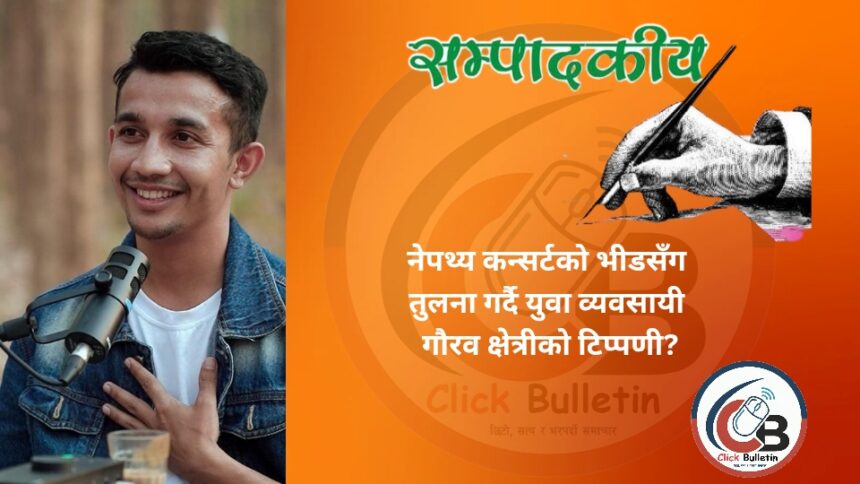 बुटवल :- युवा व्यवसायी गौरव क्षेत्रीले सामाजिक सञ्जालमार्फत हालैको एक सार्वजनिक कार्यक्रममा देखिएको भीडबारे टिप्पणी गरेका छन्।